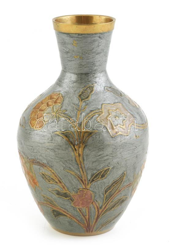 Leírás: Zománcos réz váza, kopásokkal, m: 16 cm
