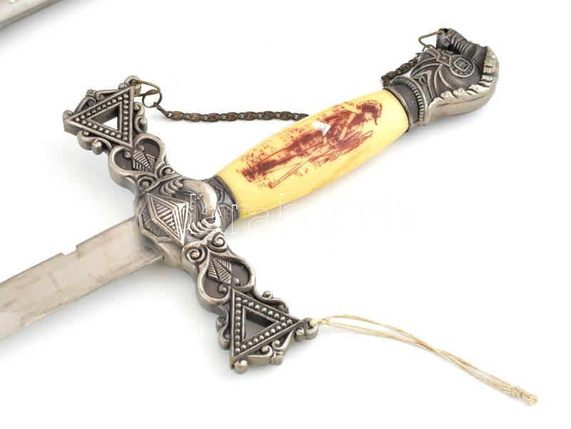 Fantázia kard, kosfejes hüvellyel, díszes markolattal. . 100 cm https://www.darabanth.com/hu/439-Gyorsarveres/439.0/Mutargy-papirregiseg-egyeb/Fegyverek-kesek~1500004/Fantazia-kard-kosfejes-huvellyel-diszes-markolattal-100-cm~II2883221