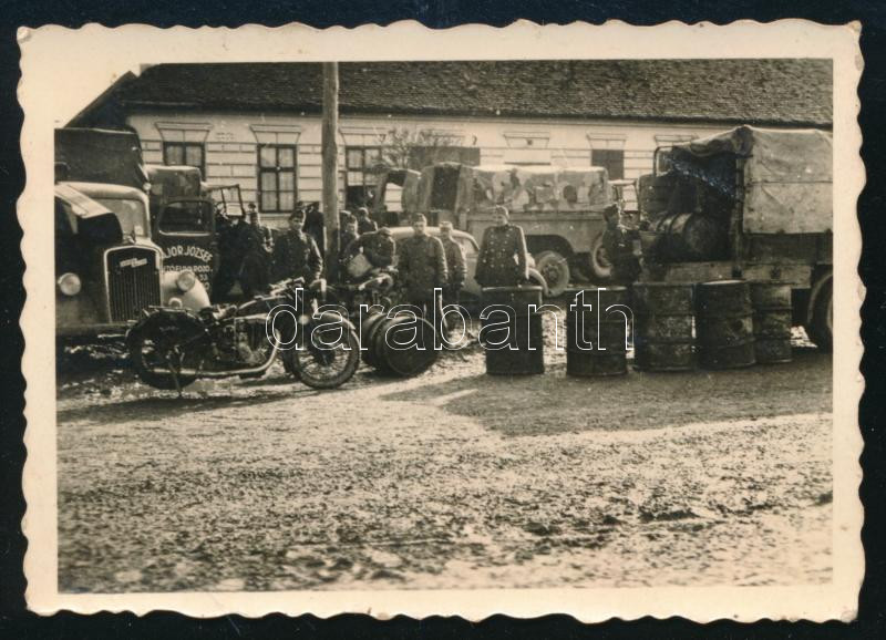 Leírás: 1941 Magyar gépesített katonai egység tankolása Topolyán (Délvidék), fotó, hátoldalt felirattal, 4,5×6 cm