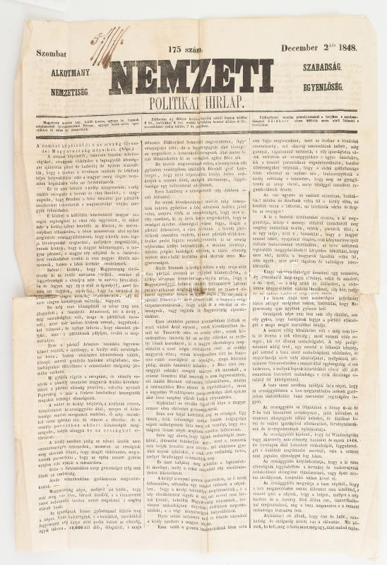 1848 A Nemzeti c. politikai napilap december 2-i. száma. benne a nemzet képviselőinek és az ország főrendjeinek a magyar néphez (intézett felhívása) 4p.