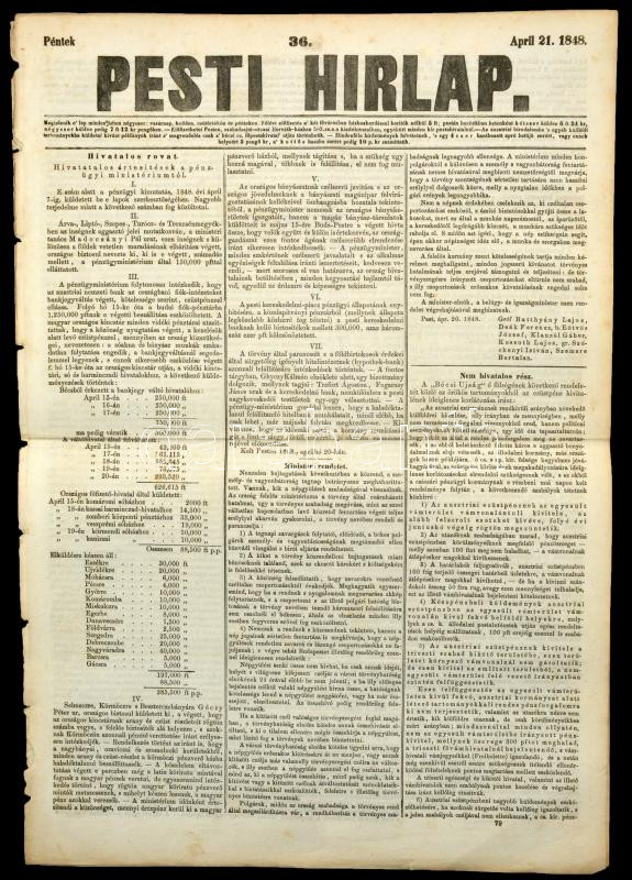 1848 április 21., Pesti Hirlap lapszáma, a forradalom és szabadságharc híreivel, korabeli reklámokkal, hajtásnyommal, lapszéli apró sérülésekkel. két lap elvált