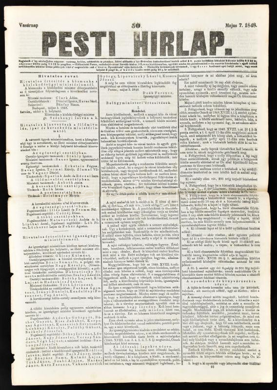1848 május 7., Pesti Hirlap lapszáma, a forradalom és szabadságharc hí... https://www.darabanth.com/hu/439-Gyorsarveres/439.0/Mutargy-papirregiseg-egyeb/Nyomtatvanyok~1500008/1848-majus-7-Pesti-Hirlap-lapszama-a-forradalom-es-szabadsagharc-hireivel-korabeli-reklamo~II2885628