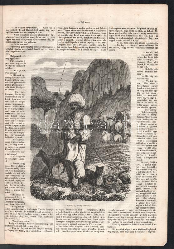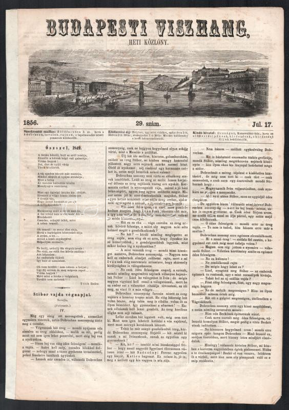1856 Budapesti Visszhang 29. szám Jul. 17. 1856. A címlapon a budapesti panoráma fametszetű képével, a Lánchíddal, a budai királyi palotával, háttérben a Gellért-heggyel. Pest, Herz János, valamint 2 szövegközti fametszetű képpel illusztrált, korabeli reklámokkal, restaurált, 237-244 p.
