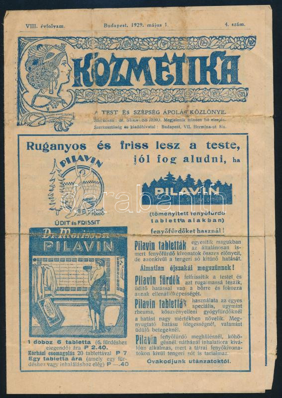 1929 Kozmetika c. lap VIII. évf 4. szám, megviselt állapotban https://www.darabanth.com/hu/439-Gyorsarveres/439.0/Mutargy-papirregiseg-egyeb/Nyomtatvanyok~1500008/1929-Kozmetika-c-lap-VIII-evf-4-szam-megviselt-allapotban~II2876693