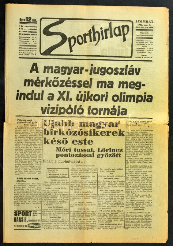 1936 Sporthirlap XXVII. évf. 63/a. sz., 1936. aug. 8., a címlapon: "A magyar-jugoszláv mérkőzéssel ma meginudl a XI. újkori olimpia vizipóló tornája", kis lapszéli szakadásokkal, 8 p.