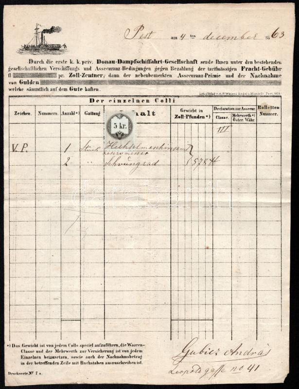 Leírás: 1863 Vác- Pest DDSG fuvarlevél hajó bélyegzővel / DDSG bill of freight.