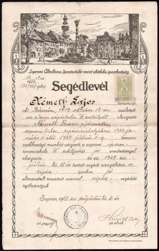 Leírás: 1937 Soproni Általános Ipartestület soproni cípészmester részére, fejléces papíron, javított.