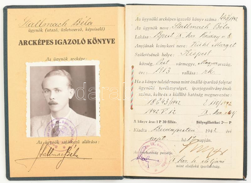 1942 Utazó ügynök fényképes igazolvány https://www.darabanth.com/hu/439-Gyorsarveres/439.0/Mutargy-papirregiseg-egyeb/Okmanyok~1000020/1942-Utazo-ugynok-fenykepes-igazolvany~II2886346