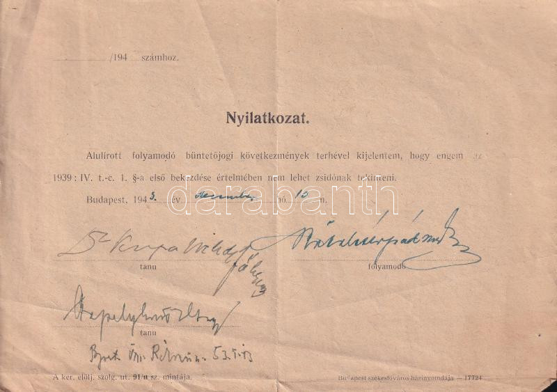 1943 Zsidótörvény alóli mentességről szóló nyilatkozat https://www.darabanth.com/hu/439-Gyorsarveres/439.0/Mutargy-papirregiseg-egyeb/Okmanyok~1000020/1943-Zsidotorveny-aloli-mentessegrol-szolo-nyilatkozat~II2886379