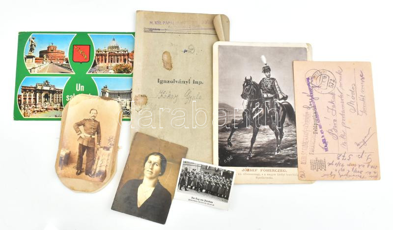 Vegyes papírrégiség, közte I. világháborús tábori posta levelezőlap (megírva, bélyegzésekkel), cigaretta-gyűjtőkép a hitleri Németországból, József főherceget ábrázoló kép, stb.; össz. 7 db. Vegyes, részben sérült állapotban.