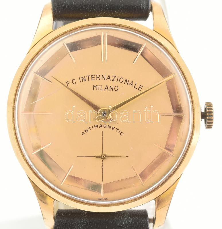 cca 1966 FC. Internazionale Milano Antimagnetic, svájci karóra, bőr szíjjal, karcos plexivel, de hibátlan számlappal, kézi felhúzós, működik. A tulajdonos az órát az 1966-os Vasas - Internationale népstadionos mérkőzésre kapta. /