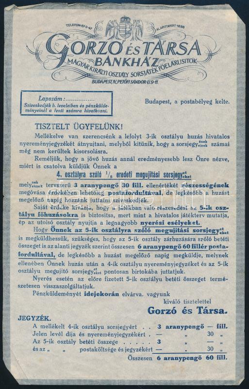 cca 1930 Gorzó és Társa Bankház sorsjegy reklám nyomtatványok 3 db https://www.darabanth.com/hu/439-Gyorsarveres/439.0/Mutargy-papirregiseg-egyeb/Reklam~1000024/cca-1930-Gorzo-es-Tarsa-Bankhaz-sorsjegy-reklam-nyomtatvanyok-3-db~II2876726