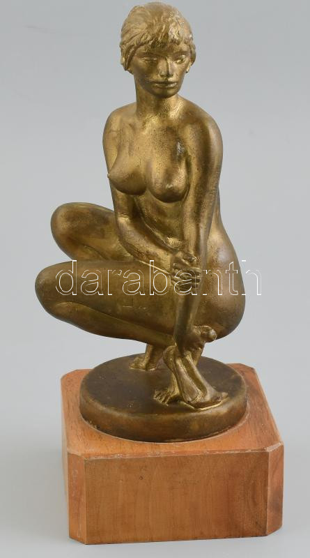 Leírás: Rácz Edit (1936- ): Akt. Bronzírozott műanyag, képcsarnokos címkével, hibátlan, jelzett, m:23 cm