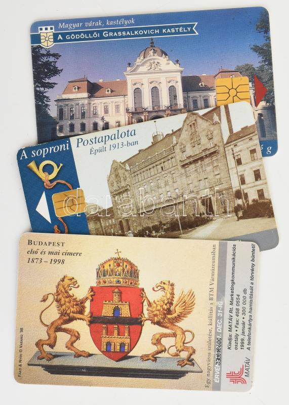 Leírás: 3db telefonkártya: Gödöllői kastély, hátoldalán Erzsébet királyné (Sisi); Soproni postapalota; Budapest címere