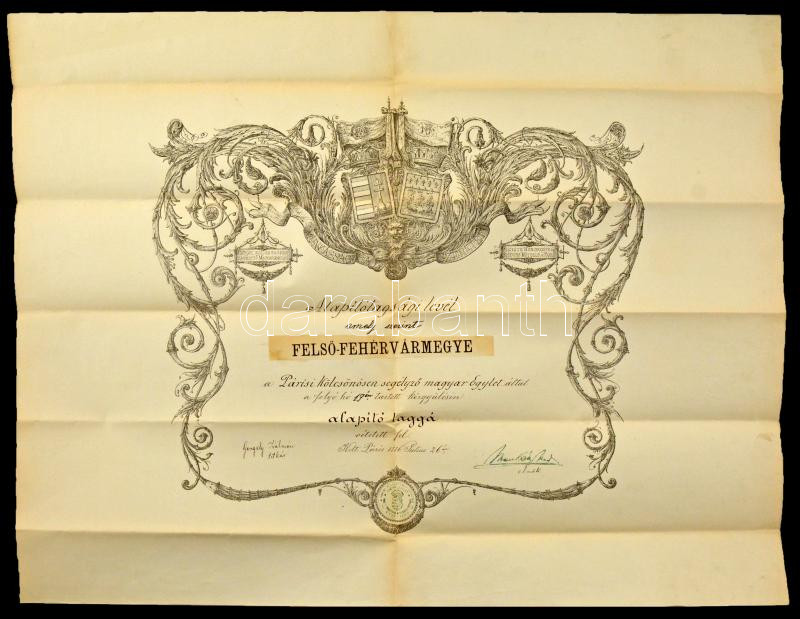 1886 A Párizsi Kölcsönösen Segélyező Magyar Egylet nagy méretű oklevel... https://www.darabanth.com/hu/439-Gyorsarveres/439.0/Mutargy-papirregiseg-egyeb/Tortenelmi-dokumentumok-keziratok-erdekessegek~1000021/1886-A-Parizsi-Kolcsonosen-Segelyezo-Magyar-Egylet-nagy-meretu-oklevele-alapito-tag-reszC3~II2882222