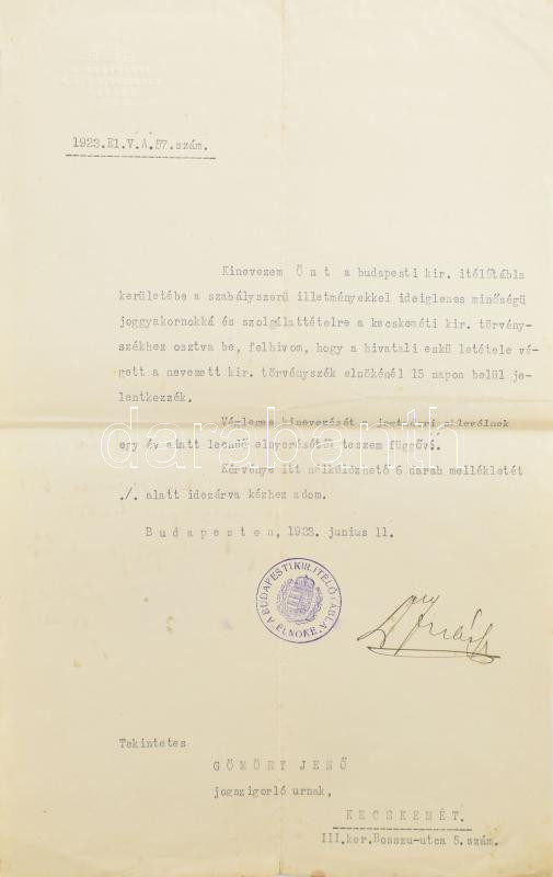 Leírás: 1923 Juhász Andor, a Kúria későbbi elnöke által aláírt hivatalos irat.