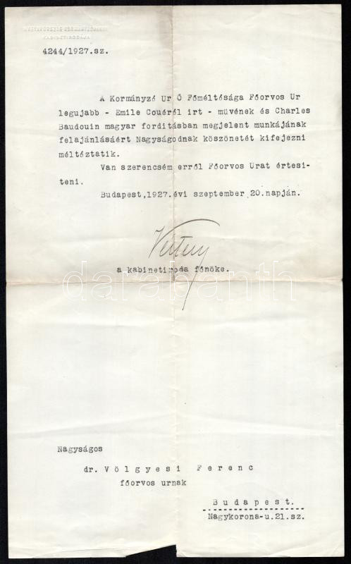 1927 Dr. Völgyesi Ferenc (1895-1967) orvos, pszichiáter és hipnotizőrnek írt levél Horthy Miklós kormányzó kabinetiodája vezetőjének, Vértessy Sándornak aláírásával, melyben a kormányzó nevében megköszöni Emil Couréről írt munkájának megküldését.