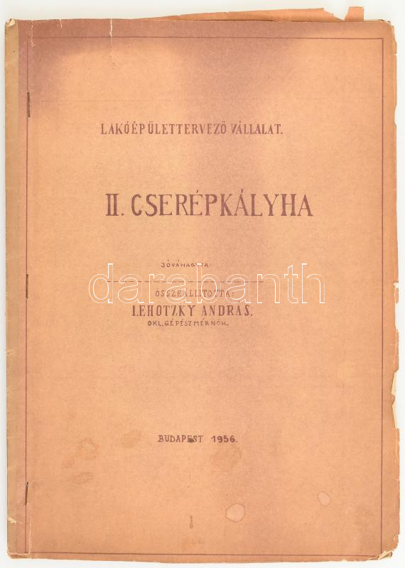 Leírás: 1956 II. Cserépkáhlya. (Tervdokumentáció). Összeáll.: Lehotzky András. Bp., 1956, Lakóépülettervező Vállalat. Kihajtható táblákkal. Tűzött papírkötés, helyenként kissé sérült.