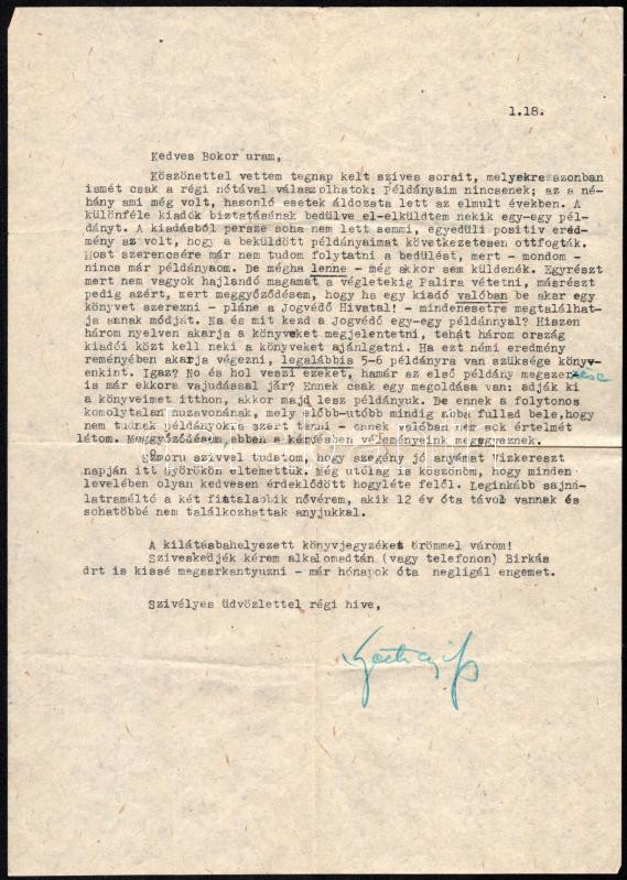 gróf Széchenyi Zsigmond (1898-1967) vadász, utazó, író autográf aláírással ellátott levele Bokor Dezső szerkesztőnek melyben kiadói ügyek mellett anyja halálhíréről is beszámol