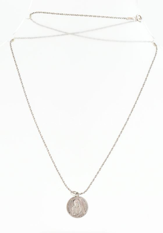 Leírás: Ezüst(Ag) vékony csavart mintás nyaklánc, Mária medállal, jelzett, h: 50 cm, d: 1,4 cm, nettó: 3,7 g