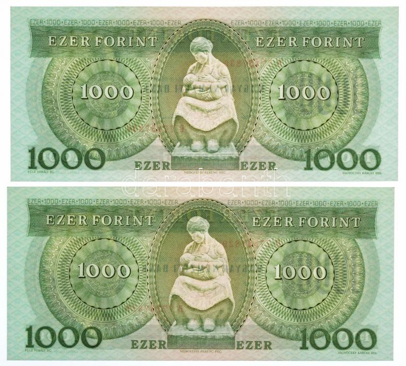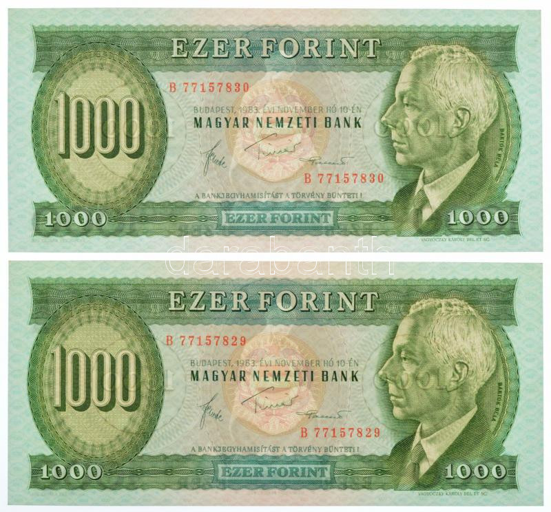 Leírás: 1983. november 10. 1000Ft (2x) sorszámkövetők "B 77157829 - B 77157830" T:I,I- / Hungary November 10,1983 1000 Forint (2x) consecutive serials "B 77157829 - B 77157830" C:UNC,AU Adamo F45