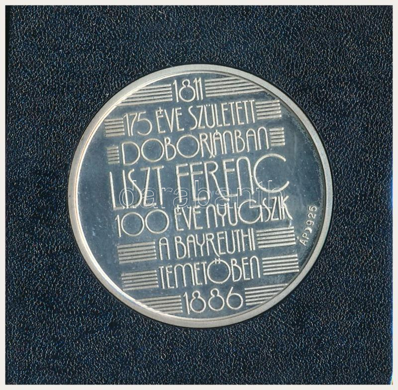Fülöp Zoltán (1951-2004) 1986. "175 éve született Doborjánban Liszt Ferenc - 100 éve nyugszik a bayreuthi temetőben" jelzett Ag emlékérem ÁPV műbőr tokban, tanúsítvánnyal (12g/0.925/32mm) T:PP patina, ujjlenyomat