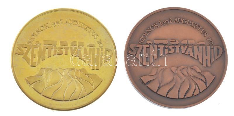 Győrfi Sándor (1951-) 1992. "Szent István híd - Szolnok 1992. augusztus 20 / Jász-Nagykun-Szolnok Megye" Br emlékérem (42,5mm) + "Szent István híd - Szolnok 1992. augusztus 20 / Jász-Nagykun-Szolnok Megye" aranyozott Ag emlékérem (36,59g/0.835/42,5mm) T:UNC (eredetileg PP)