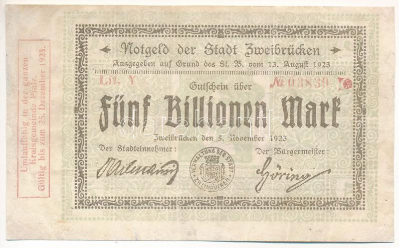 Németország / Weimari Köztársaság / Zweibrücken 1923. 5.000.000.000.00... https://www.darabanth.com/hu/439-Gyorsarveres/439.0/Numizmatika/Papir-es-fem-szuksegpenzek~500023/Nemetorszag-Weimari-Koztarsasag-Zweibrucken-1923-5000000000000M-TF-Germany-Weima~II2880082