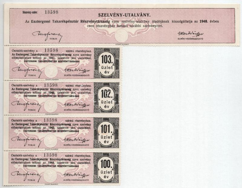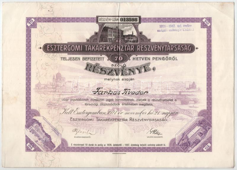 Leírás: Esztergom 1927. "Esztergomi Takarékpénztár Részvénytársaság" részvénye 70P-ről szárazpecséttel, bélyegzéssel, szelvényekkel T:III