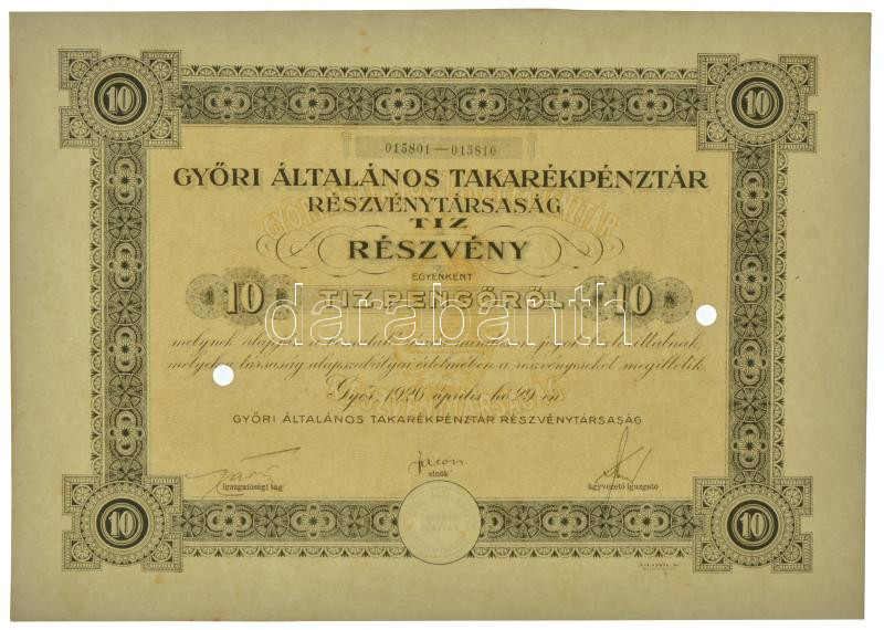 Győr 1926. "Győri Általános Takarékpénztár Részvénytársaság" tíz részvénye egyenként 10P-ről, szárazpecséttel, két lyukasztással érvénytelenítve T:XF kis folt