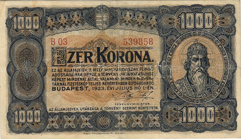 1923. 1000K "Magy.Pénzjegynyomda" T:II https://www.darabanth.com/hu/44-Gyorsarveres/44.0/Numizmatika/NUMIZMATIKA-NUMISMATICS~256/1923-1000K-MagyPenzjegynyomda-TII~II86973