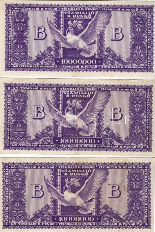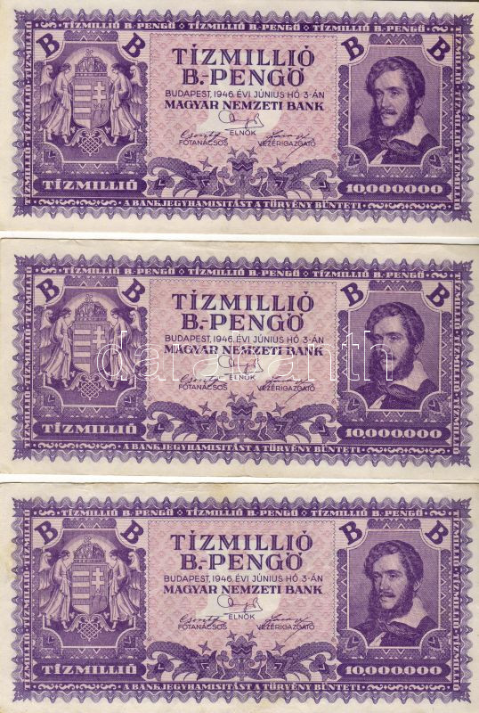 1946. 10.000.000B.-pengő (3x) T:II+ Csak egyszer hajtva (2x),II https://www.darabanth.com/hu/44-Gyorsarveres/44.0/Numizmatika/NUMIZMATIKA-NUMISMATICS~256/1946-10000000B-pengo-3x-TIIplus-Csak-egyszer-hajtva-2x-II~II87465
