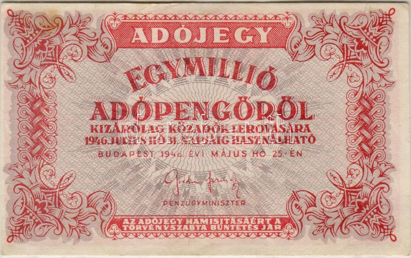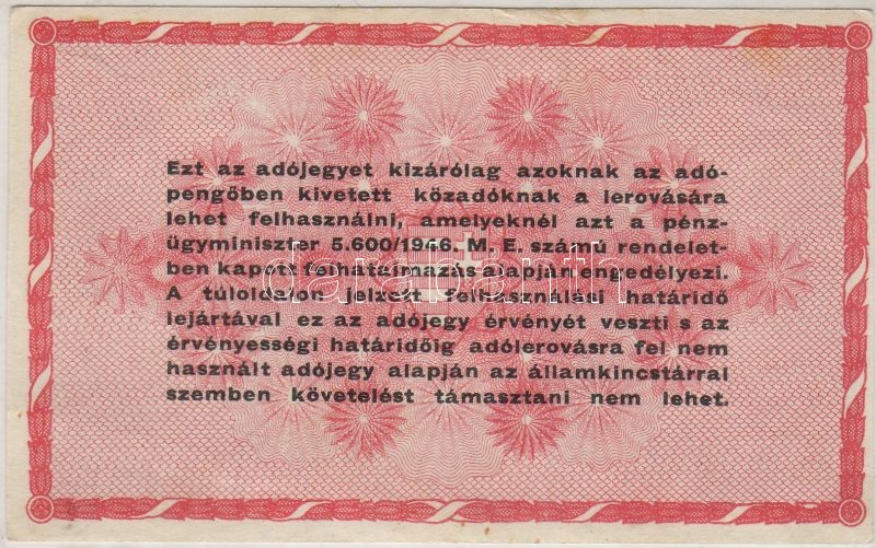 Leírás: 1946. 1000.000Adópengő évszámban ...46 erősen hiányos nyomással T:II+ Csak egyszer hajtva!