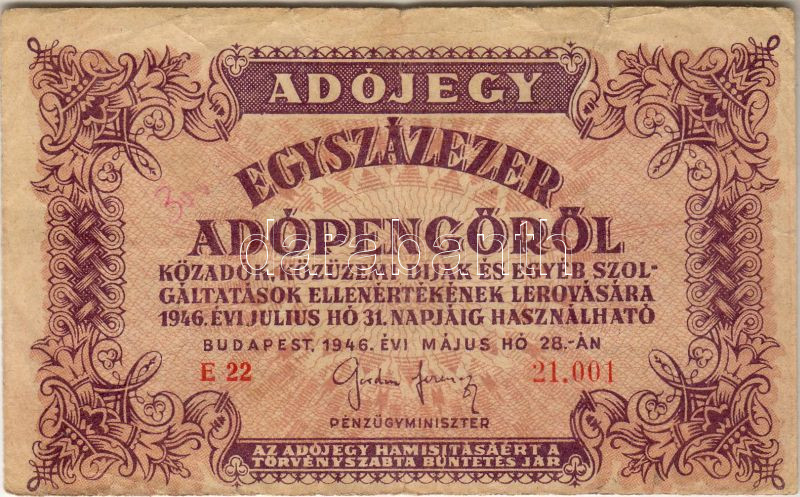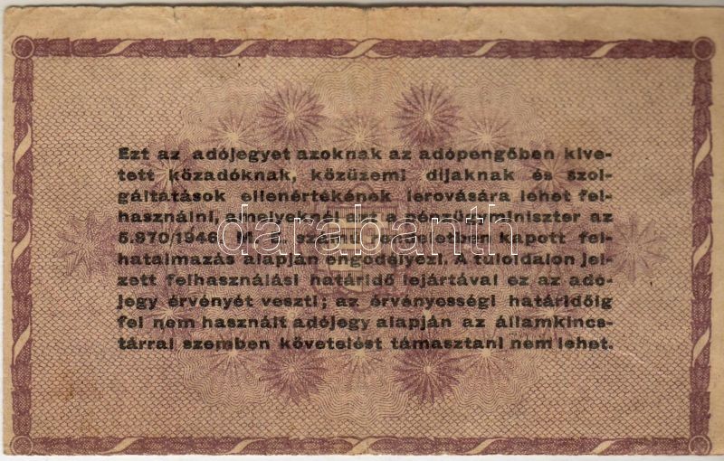 Leírás: 1946. 100.000Adópengő elő- és hátlap erősen lefelé csúszva T:II/III