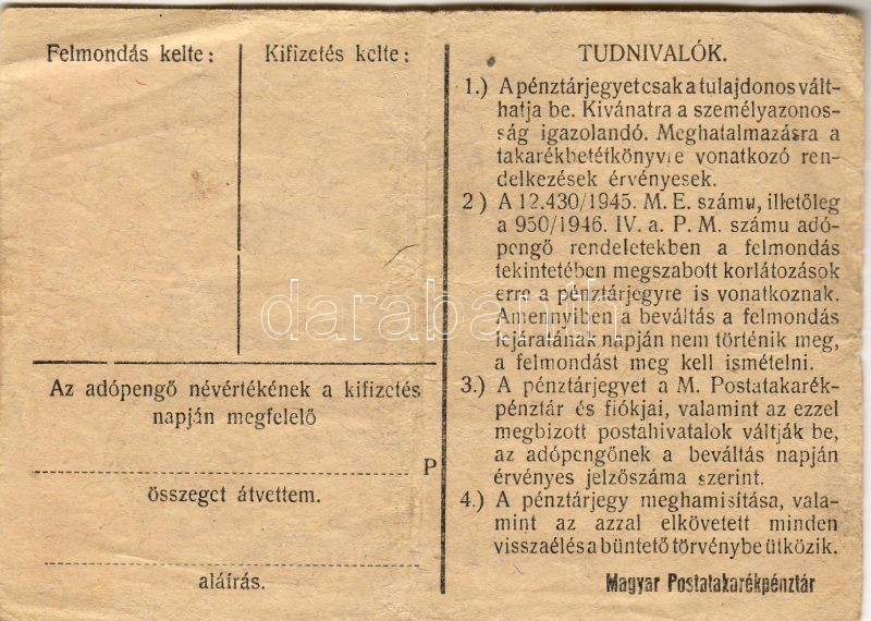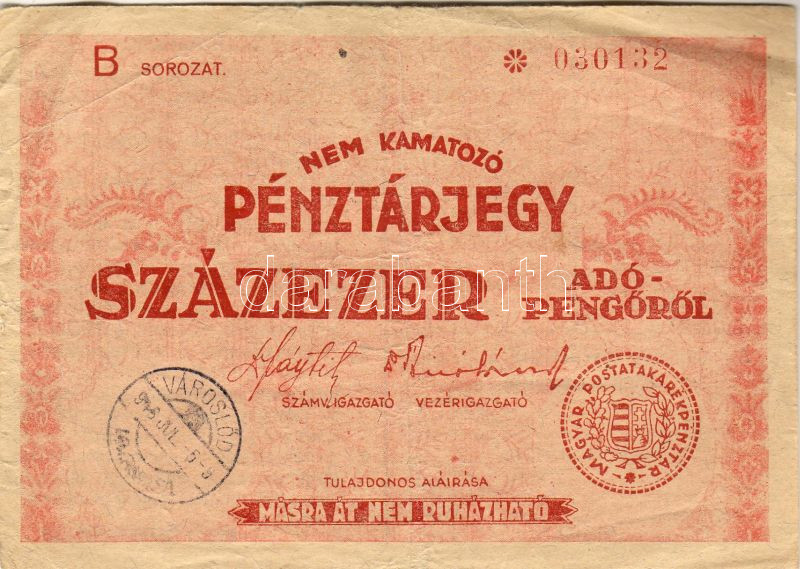 Leírás: 1946. 100.000Adópengő pénztárjegy kerek bélyegzővel, a hátoldalán számos lemezhibával, teljes és részleges betűhiányokkal! T:II/III