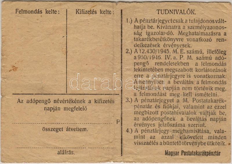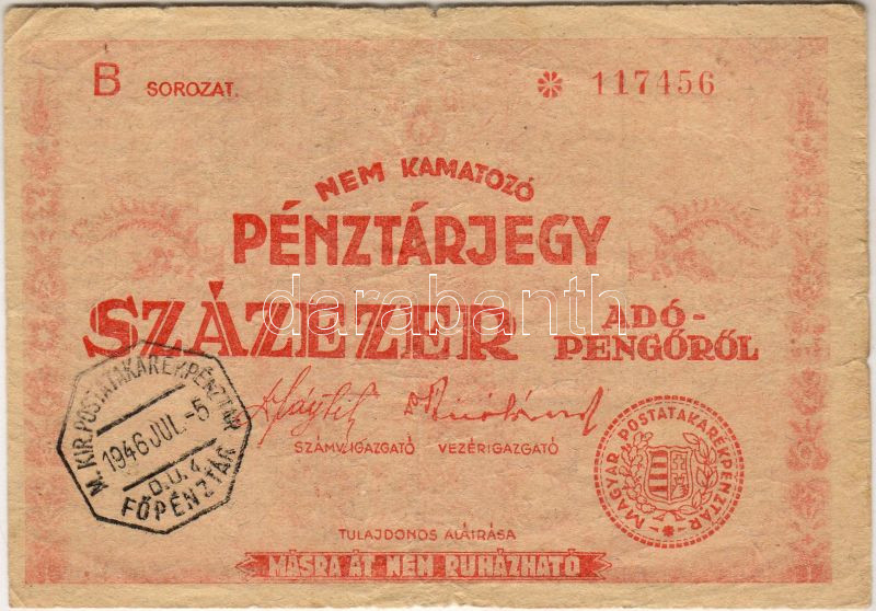 Leírás: 1946. 100.000Adópengő pénztárjegy szögletes "M.kir..." bélyegzővel T:II/III