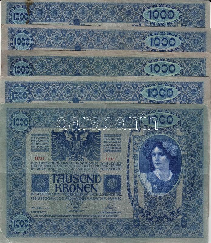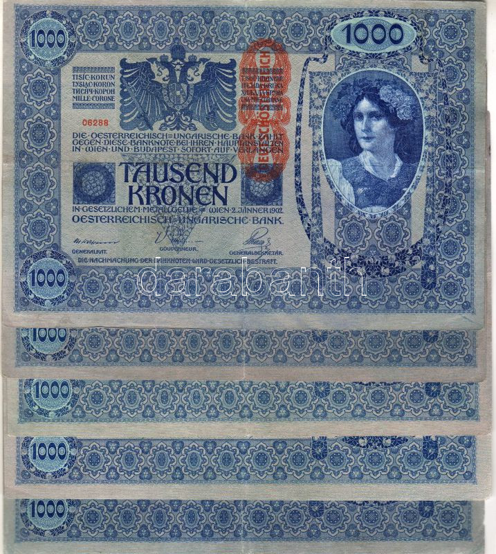 Ausztria 1908. 1000K (5x) piros "Deutschösterreich" fny-sal T:II https://www.darabanth.com/hu/44-Gyorsarveres/44.0/Numizmatika/NUMIZMATIKA-NUMISMATICS~256/Ausztria-1908-1000K-5x-piros-Deutschosterreich-fny-sal-TII~II86992
