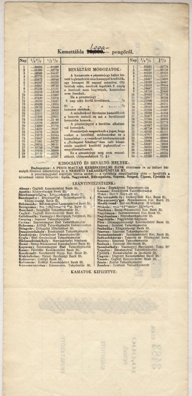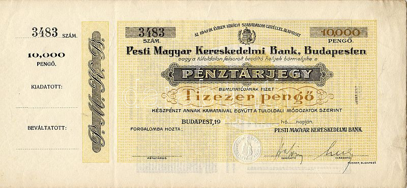 Budapest 19.. (feltehetően 30-as évek) "Pesti Magyar Kereskedelmi Bank" 10.000P pénztárjegy (bankközi forgalomra) aláírt, fel nem használt darab, szelvénnyel! Hátoldalon nyomdahiba "5000P2 tintával áthúzva kézírással 1000P-re kiigazítva! RRR!!! T:I-