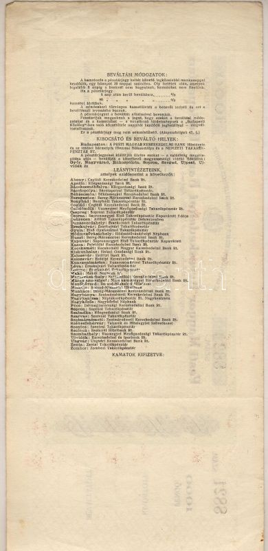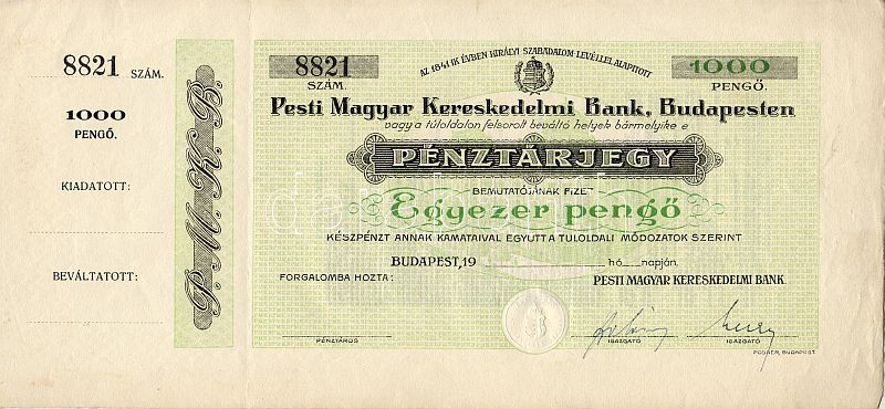 Budapest 19.. (feltehetően 30-as évek) "Pesti Magyar Kereskedelmi Bank" 1.000P pénztárjegy (bankközi forgalomra) aláírt, fel nem használt darab, szelvénnyel! RRR!!! T:I-