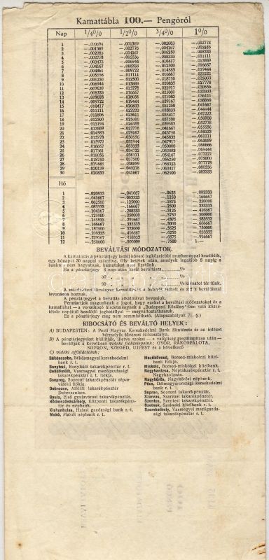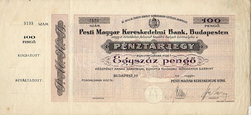 Budapest 19.. (feltehetően 30-as évek) "Pesti Magyar Kereskedelmi Bank" 100P pénztárjegy (bankközi forgalomra) aláírt, fel nem használt darab, szelvénnyel! RRR!!! T:I- jobb szélén kis rongyolodás, sarokhiány