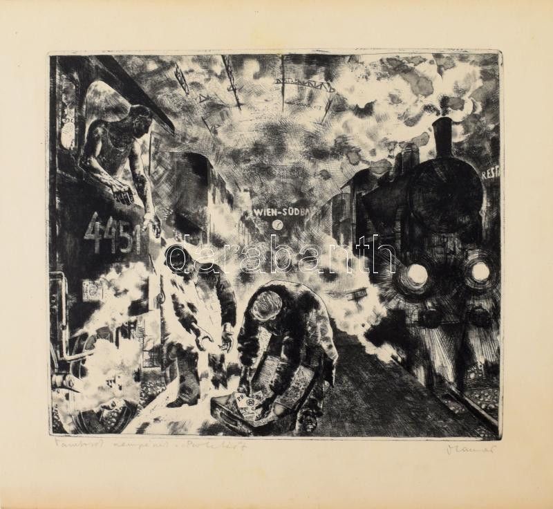 Leírás: Maurer Dóra (1937- ): Vasutasok csempészik a "Proletár"-t. Rézkarc, papír, jelzett, kartonra kasírozva. 26x30 cm