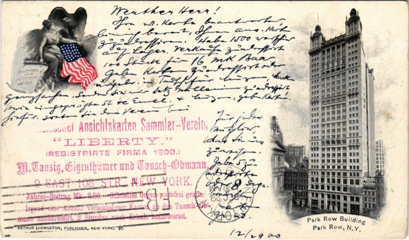 Leírás: 1900 New York, Park Row building, Allcock's Porous Plasters sign, Greetings from picturesque America, flag. Arthur Livingston Publisher No. 95. (EK)