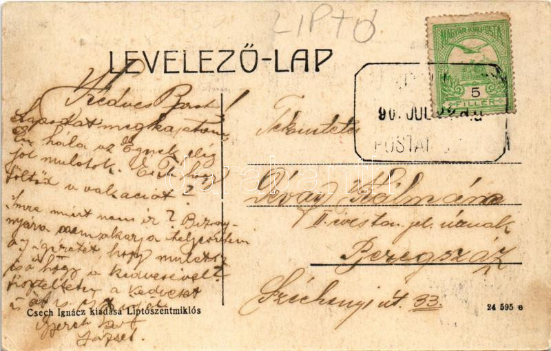 Leírás: Liptószentmiklós, Liptovsky Mikulás; Római katolikus templom, Belnay J., Vozáry Mihály üzlete. Csech Ignác kiadása / Catholic church, shops (fl)