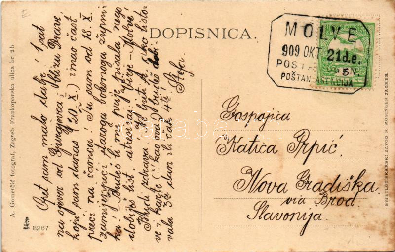 1909 Molna, Molve; Zupina crkva, Gostiona F. Spitzera, Trgovina Samuel Spitzera, Trgovina F. Spitzera / templom, F. Spitzer vendéglője és üzlete, Samuel Spitzer üzlete / church, inn, shops. Floral (fl)