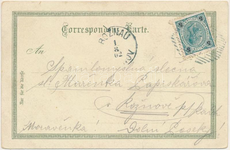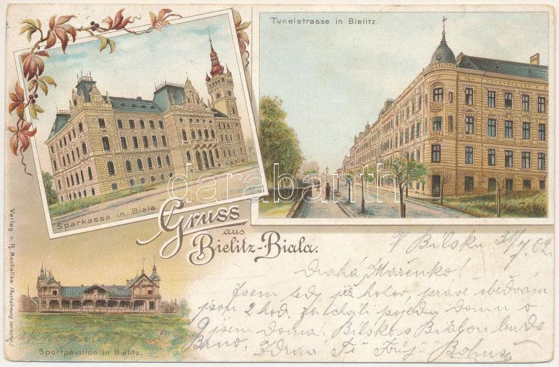1902 Bielsko-Biala, Bielitz; Sparkassa, Tunelstrasse, Sportpavillon / savings bank, street, sport pavilion. R. Machaliza Art Nouveau, floral, litho (EK)