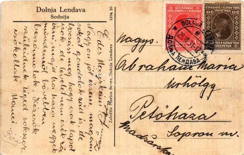 Leírás: 1931 Alsólendva, Alsó-Lendva, Dolnja Lendava; Sodnija. Zalozila Marica Sever / utcakép / street (gyűrődések / creases)