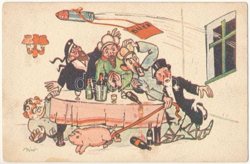 Humoros első világháborús grafikai lap. Az Antanthatalmak újévi estéje. Kiadja a Magyar Földrajzi Intézet Rt. / WWI Austro-Hungarian K.u.K. military propaganda, Anti-Entente Powers mocking humorous art postcard s: Biró