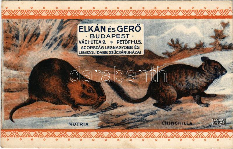 Nutria és Chinchilla. Elkán és Gerő szűcsök szőrmeáru és sapkagyár üzletének reklámja. Budapest V. Váci utca 9. és Petőfi utca 5. Grafikai Intézet R.T. / Hungarian furriers' advertisement card (EK)