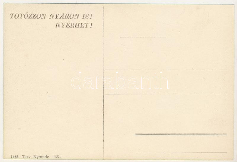 Leírás: TOTÓszelvény - toll a kézben: nyereség az üdülésben! Totó tippszelvény reklám / Hungarian lottery ticket advertisement card