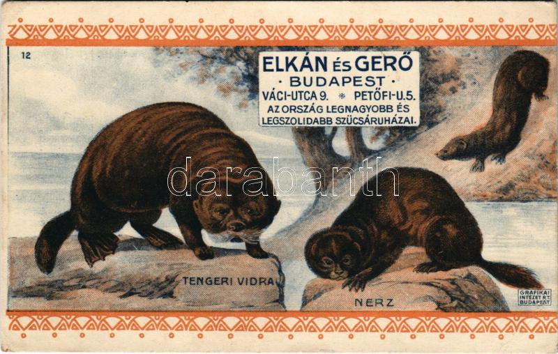Tengeri nerz és vidra. Elkán és Gerő szűcsök szőrmeáru és sapkagyár üzletének reklámja. Budapest V. Váci utca 9. és Petőfi utca 5. Grafikai Intézet R.T. / Hungarian furriers' advertisement card (EK)
